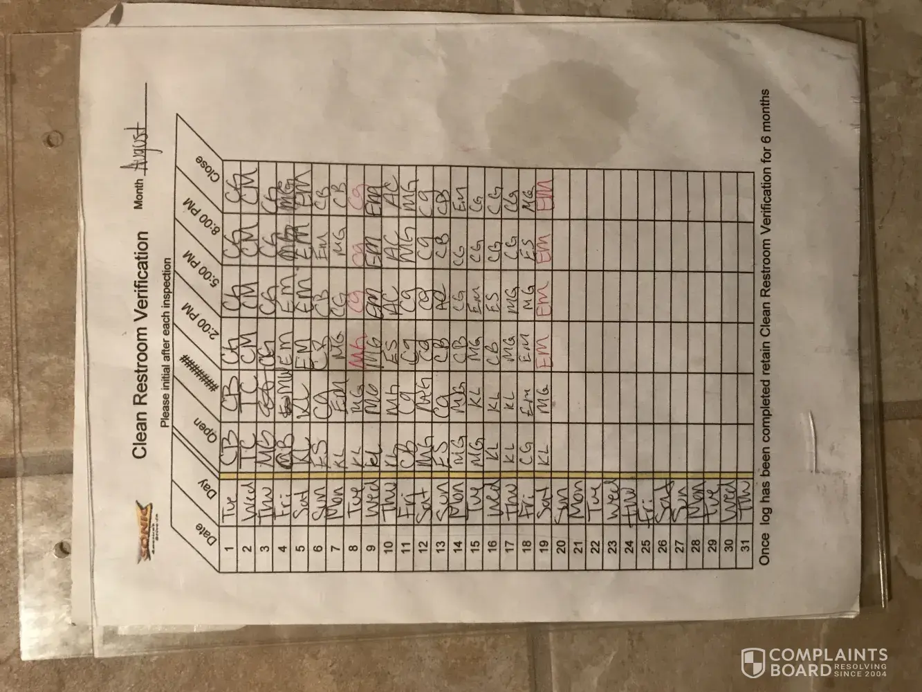 I was shocked by the condition of the restroom; then, understood why when I noticed the "Clean Restroom Verification Form" was for August and that it hadn't been completed since August 19th at Close.