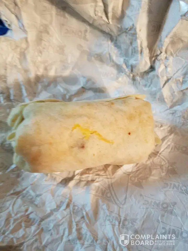 I guess this could be filed under both service and product. I arrived at the Sonic Drive-In (in Norfolk, Nebraska) at 7:45 p.m. and was in a hurry, so I went through the drive-thru. Little did I know the mistake I would be making because my food did not arrive until 8:17 p.m. I kept telling myself that because the wait was so long it's probably because they were carefully preparing the product. My food arrived and upon opening the product I was severely disappointed. I ordered a premium breakfast burrito and a bacon breakfast burrito. Image #00 is the bacon breakfast burrito which was smaller than a taco. I hoped after paying almost seven bucks for the premium breakfast combo that would not disappoint. As you can see by image #02, that burrito was even smaller than the previous one and I added the dollar bill next to it as a size comparison. If I had known I would wait over 32 minutes for essentially two tacos, I would have gone elsewhere. The only positive from this experience was they got my chocolate coke correct. I do not feel like I received over $10 in food and will probably not be back to Sonic for some time.