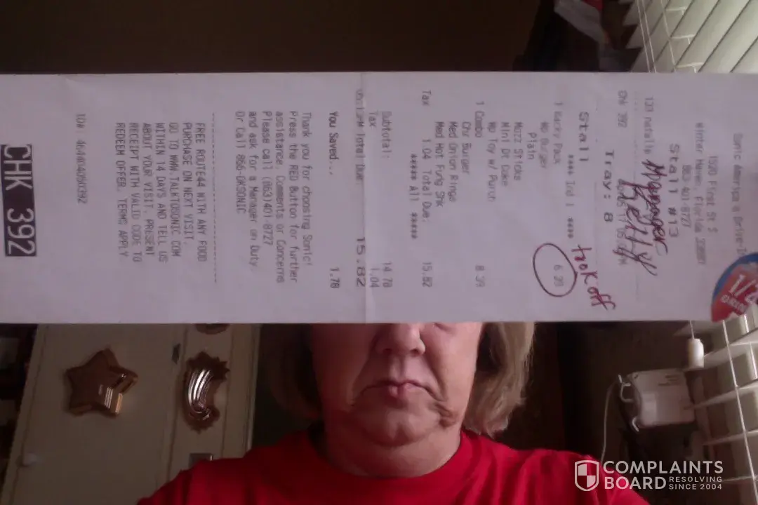 My mother and I ate at Sonic on 4/5/17 in Winter Haven, Florida. Our bill was incorrect. The manager took off the $6.39 Wacky Pack. I asked her for the receipt for the refund and she was unable to provide it. Her name was Kelly. When I got my credit card statement, the refund wasn't on there. I have attached a photo of the original receipt.