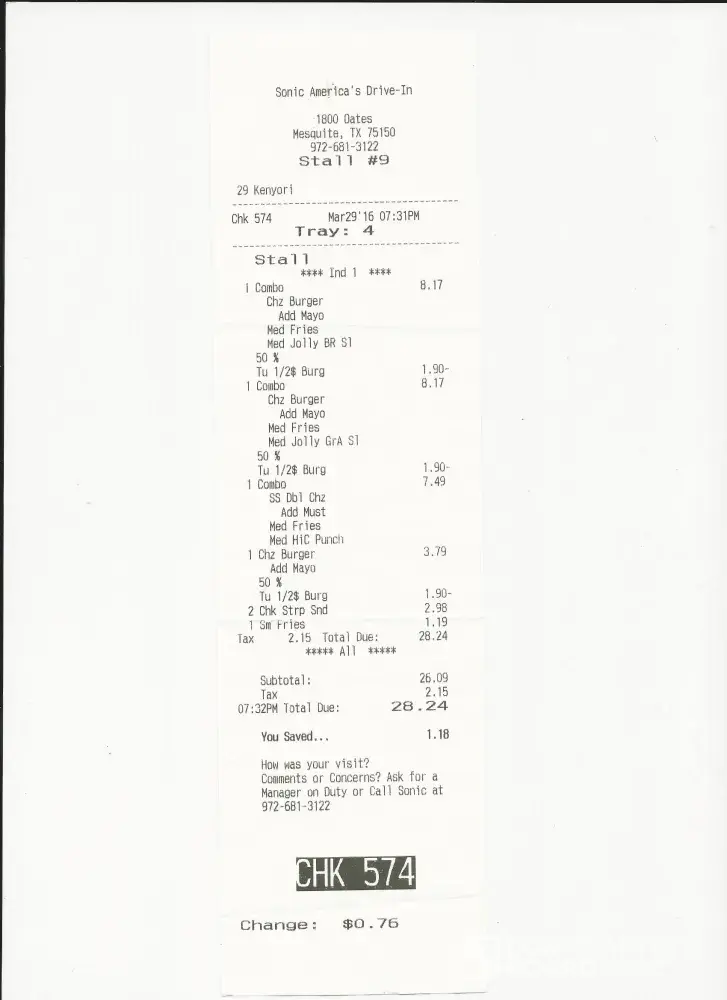 In Mexico Mo sonic drive in on Saturday night we stopped in and ordered 2adult combo meals and a kids meal. They had a hard time with the order so was not surprised when it was wrong. First of all we could not understand how this could cost $27+ as they said but when they delivered it there was a extra sandwich that cost $4.49 we notified them and they took the sandwich and the receipt. When they come back they brought $1.10. We said we did not agree with this. They again took the receipt in and said they would check it. After 20 min they had not returned so we left as we were not going to get any more money back.