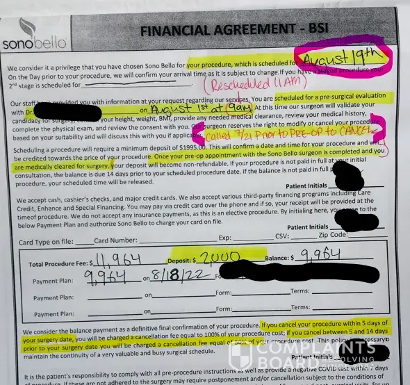 Sono Bello Booking a surgical procedure, canceling within 24 hours of booking, and not being refunded