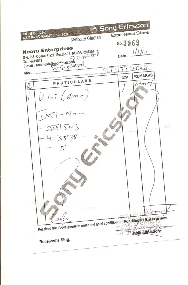 IMEI no [protected]) on 07/01/10 from Neeru Enterprises, Sec 18, NOIDA.