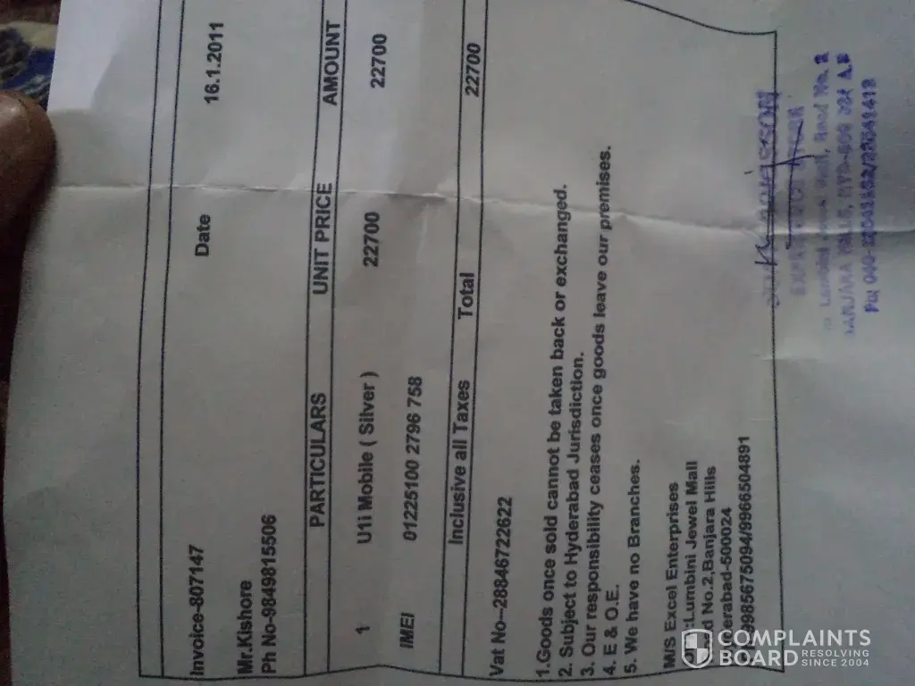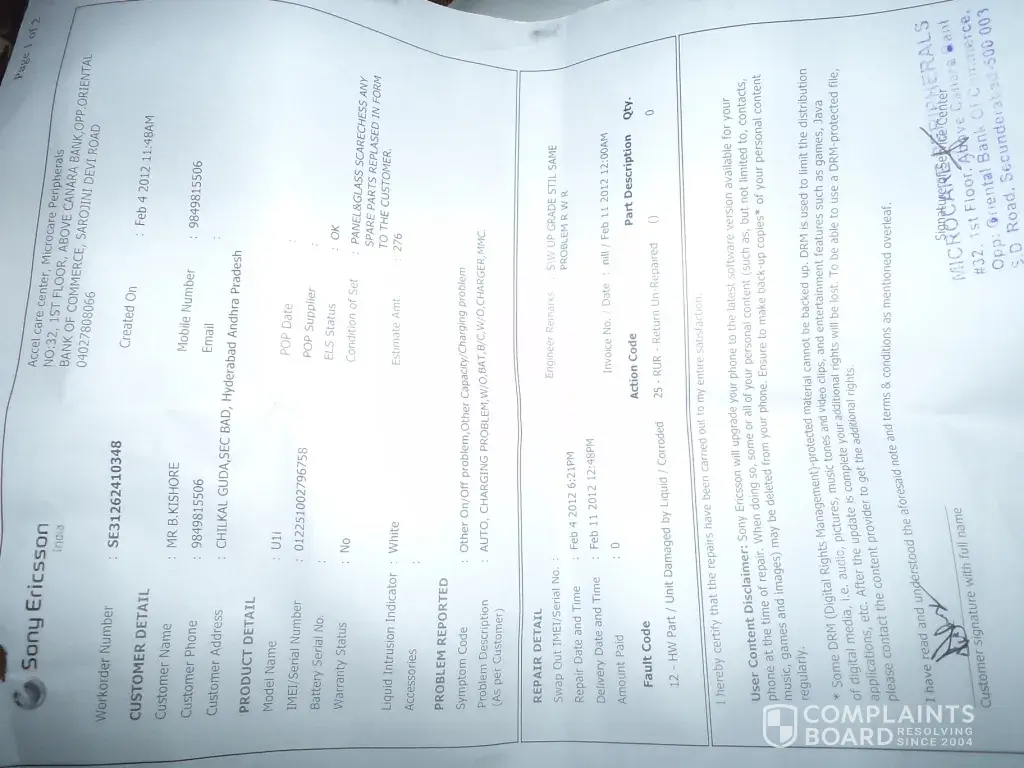 Can someone help me out, how to raise a complaint in Consumer Court. I have purchased Sony Ericsson Satio U1i Model Mobile with cost Rs. 22700/- on January 16th 2011 and after exact 1 year its got dead mode. i.e., from January 23rd 2012, its not working i have reached out nearest Sony Ericsson authorised service centers at Punjagutta and Secunderbad, they said that now the mobile is no use we dont have technicians.. is this the way they spoke with customer ... please kindly help me how to get file a case on service centers and the sony manufactures... dont know what happen to mobile suddenly got switched off and when i have switched on and after a minute it again shows the same problem... and i have updated the mobile software for 4 to 5 times and still the same problem... please mail me if any one has the information regarding how to raise the case on sony manufactures. my mail id is [protected]@yahoo.com