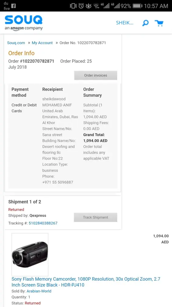 After that I reserved SMSs stating that (Hello, your Souq.com shipment [protected] is out with our courier, please expect the delivery today at your registered address) after I receive one more SMS as follow: