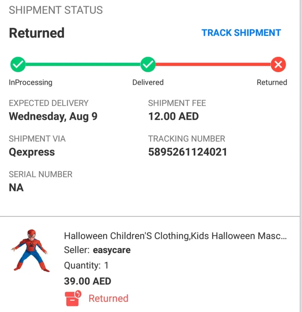 I booked by Souq.com Mobile apps, Halloween children's clothing kids (Ordered ID [protected]) Tracking number [protected] and expected delivery was 9th Aug'17 and same day I receive call from your delivery person and I told him very clearly, I need this product same day itself cause I have confirmed flight for next day and he also agree and confirm me will speak to supervisor to arrange delivery on same day...