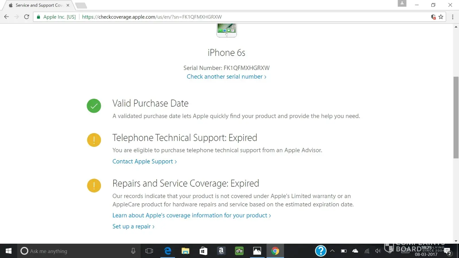 this phone's serial is actually for IPhone5C not IPhone5S, the board was removed from its original housing and placed in another IPhone5S cover, thus it is not genuine, therefore, they refused to even support to repair it even outside the guarantee.