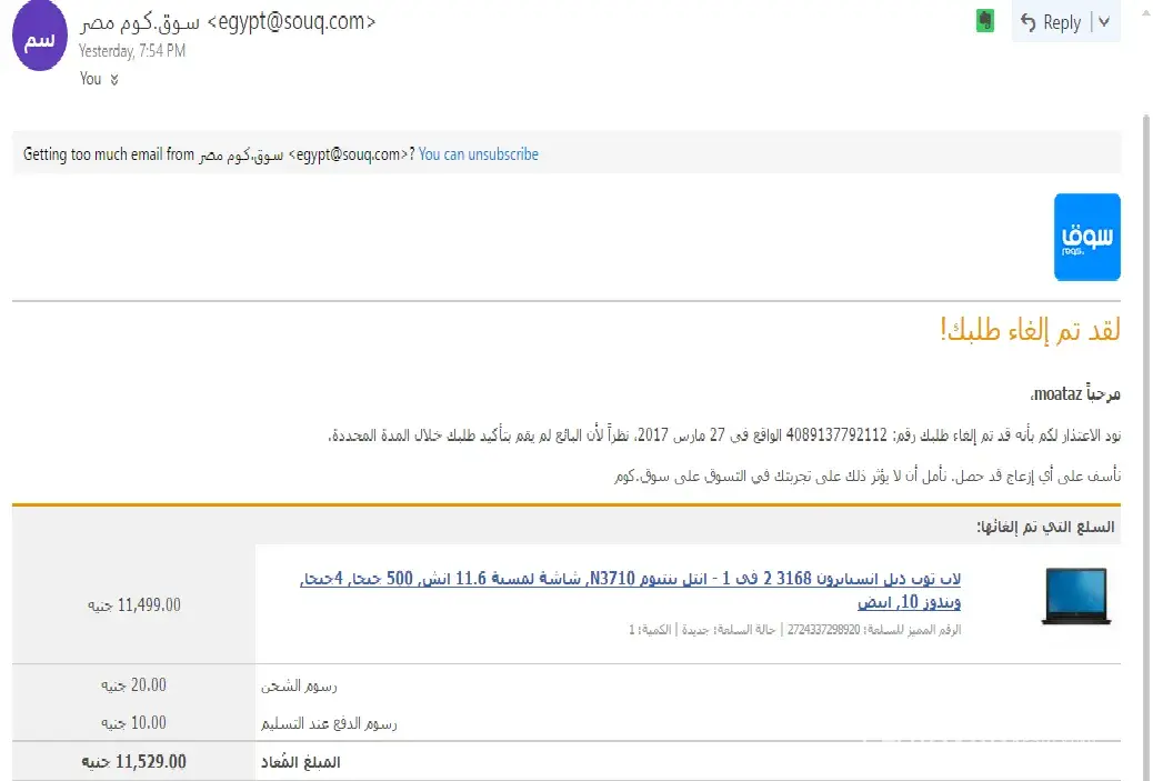 Regarding to the mail below, I need an explanation for the below cancellation after confirming the process as per attached mail. I've contacted with a customer service representative and told me that the supplier refused to complete the deal! actually i'm not dealing with a specific supplier i'm dealing with SOUQ Egypt - as a trusted shopping website - . So, I'm claiming this unprofessional and irrespective way of dealing as it's not my problem if your supplier refused or changed prices after confirming a deal with specific price.
