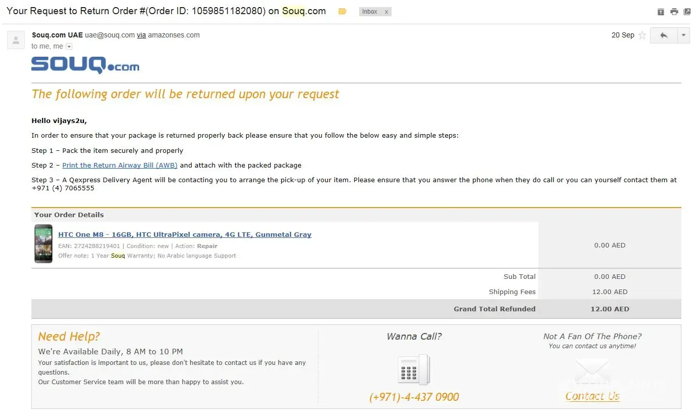 Sent from my iPad Begin forwarded message: From: Mayank Date: 2 November 2015 at 8:07:10 PM GMT+4 To: "souq.com" Cc: [protected]@gmail.com Subject: Re: Ticket Received - [#3979337] Complaint - Return - Technical issue How is this ticket closed even after so many reminders and calls and promises to collect from your end, please reopen and collect defective item Sent from my iPad On 02-Nov-2015, at 8:04 PM, Mayank wrote: Reminder Sent from my iPad On 01-Nov-2015, at 10:42 PM, Mayank wrote: Still await collection between 1400 to 1700 hrs. Sent from my iPad On 30-Oct-2015, at 11:54 PM, Mayank wrote: Reminder Sent from my iPad On 30-Oct-2015, at 12:49 AM, Mayank wrote: Still await collection Sent from my iPad On 26-Oct-2015, at 7:47 PM, Mayank wrote: Still await collection no contact done by courier for collection Sent from my iPad On 25-Oct-2015, at 8:40 AM, souq.com wrote: Dear Mayanksharmadehradun, Thank you for contacting Souq.com Customer Service. Your request has been received, and a ticket has been created for you with reference ID: 3979337. Ticket Details Subject: Complaint - Return - Technical issue Description: Dear Customer, Thank you for contacting us. We are currently working on your query and one of our customer care representatives will contact you shortly. Thank You, Customer Care Team. Please visit the link below to view more details: http://support.souq.com/public/tickets/14ae4df32c397754c305248f0beb45e467543c05569477127c9712813ca2ea8a Our team is looking into your request and you can expect next to be contacted with either an answer to your question(s) or a solution to the issue(s) raised. Our expected time-frames to respond will vary according to the severity or complexity of the matter being addressed and volume of contacts reaching us. However we assure you that we are working to get back to you as fast as possible and to properly address your questions and concern. You can use this ticket reference ID in any future communication with any member of the Souq.com Customer Service team. Thank you and wish you all the best, Souq.com Customer Service Team 3979337 Sent from my iPad Begin forwarded message: From: "souq.com" Date: 20 October 2015 at 11:33:53 AM GMT+4 To: [protected]@gmail.com Subject: Ticket Received - [#3939954] Inquiry - Return - Return status Reply-To: "souq.com" Dear Mayanksharmadehradun, Thank you for contacting Souq.com Customer Service. Your request has been received, and a ticket has been created for you with reference ID: 3939954. Ticket Details Subject: Inquiry - Return - Return status Description: Buyer called for return update Please visit the link below to view more details: http://support.souq.com/public/tickets/ee10ef3772d89f8b97034357c86935336376bd853f5923f7d25bfa80d8c612ba Our team is looking into your request and you can expect next to be contacted with either an answer to your question(s) or a solution to the issue(s) raised. Our expected time-frames to respond will vary according to the severity or complexity of the matter being addressed and volume of contacts reaching us. However we assure you that we are working to get back to you as fast as possible and to properly address your questions and concern. You can use this ticket reference ID in any future communication with any member of the Souq.com Customer Service team. Thank you and wish you all the best, Souq.com Customer Service Team 393995 Sent from my iPad Begin forwarded message: From: "souq.com" Date: 20 October 2015 at 11:33:53 AM GMT+4 To: [protected]@gmail.com Subject: Ticket Received - [#3939954] Inquiry - Return - Return status Reply-To: "souq.com" Dear Mayanksharmadehradun, Thank you for contacting Souq.com Customer Service. Your request has been received, and a ticket has been created for you with reference ID: 3939954. Ticket Details Subject: Inquiry - Return - Return status Description: Buyer called for return update Please visit the link below to view more details: http://support.souq.com/public/tickets/ee10ef3772d89f8b97034357c86935336376bd853f5923f7d25bfa80d8c612ba Our team is looking into your request and you can expect next to be contacted with either an answer to your question(s) or a solution to the issue(s) raised. Our expected time-frames to respond will vary according to the severity or complexity of the matter being addressed and volume of contacts reaching us. However we assure you that we are working to get back to you as fast as possible and to properly address your questions and concern. You can use this ticket reference ID in any future communication with any member of the Souq.com Customer Service team. Thank you and wish you all the best, Souq.com Customer Service Team 3939954 Sent from my iPad Begin forwarded message: From: Mayank Date: 19 October 2015 at 10:29:24 PM GMT+4 To: "souq.com" Cc: [protected]@gmail.com Subject: Re: Ticket Closed - [#3925680] Negative Feedbak - Order ID: [protected] - Seller:cellsafe - Marketplace Dear Sir/Madam, The article was supposed to be collected by courier today between two and five pm as per my telephone conversation with customer care yesterday but sadly the courier is calling me at ten am in morning when I am not there or anyone from family also not there .So please arrange for courier to collect and return between two and five pm Thanks Mayank Sent from my iPad On 19-Oct-2015, at 1:28 PM, souq.com wrote: Dear Mayanksharmadehradun, Thank you for contacting Souq.com Customer Service. As we have not heard from you for a while; we hope that our solution and response has met your expectations. Hence we are closing the ticket. Ticket Details Subject: Negative Feedbak - Order ID: [protected] - Seller:cellsafe - Marketplace Description: Feedback Comment: Item does not work as described Item Info: Title: Mini 5 Port 1080P Video HDMI Switch Switcher Splitter with IR Remote lym C1183 Price: 3066 EAN: [protected] Offer Note: Buyer Info: Nickname: Mayanksharmadehradun Seller Info: Nickname: cellsafe Response sent: Please visit the