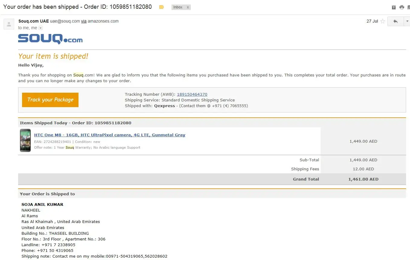 Hi. I purchased one mobile online from Souq.com The Item was scheduled for delivery since 3 days, but it is not delivered. I called customer care and requested to pick up the package from their Al Quz warehouse and they keep telling me that they are looking for my package since 3 days! Total mess.