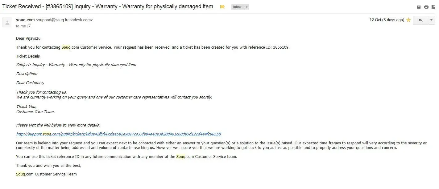 What a useless 1 year Warranty you are giving. I had purchased Dell Tablet on Jan '2015. I couldn't use one time, Software error. Souq.com didn't solve the issue. Poor after sales support. Order Number/ID: [protected] see the below ticket & email communications. http://support.souq.com/.../72a308cb5f60800fbe0eb4387c76ecb9 http://support.souq.com/.../923bbd1bf1872a411b15fa67e8c07cb1