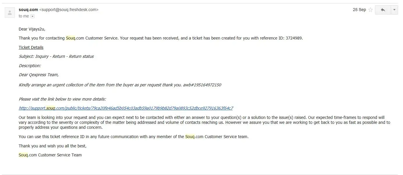 My experience with Souq.com is a memorable one.. I bought a BUSTED Samsung mobile from Souq.com in which I tried to send it back to repair thru the famous QExpress. I waited 10 days calling them daily for a pickup and they kept promising me daily for that pickup. At last, I gave up and asked them for a solution to my agony. their solution was for me to leave my work and deliver it myself to their Quooz store which I ended up doing. the worst part is that Souq.com did nothing about it. I complained and called a lot, asked to speak to a supervisor but no action was taken except these useless mails I received from them. that taught me a lesson NEVER TO BUY from Souq.com and never use QExpress again..