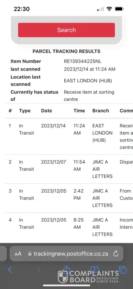South African Post Office [SAPO] Missing package. East London Hub