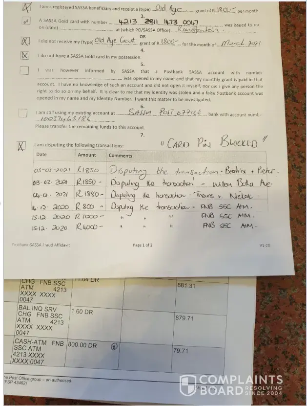 I went to the Post Office in Randfontein in March 2021. Fraudsters stole the SASSA pension money of my mother - MME Kleingled - Dimentia patient staying in an old age Frail care facility. I took her with me to the post office, we completed a affidavit and they provided me with a statement of all the withdrawels. I indicated on the affidavit all the transactions that was not withdrawn by her. It was withdrawn all over in Gauteng. since then i have many emails to them to inform on the outcome of the fraud on her SASSA money. I do not get any feedback from anyone. Kindly please provide an email address so that i can forward you the emails, statement of SASSA and then the picture i took of the affidavit submitted to them. Not able to upload the statement for you - pdf. Thank you in advance. Ria Reynolds - [protected] - [protected]@sars.gov.za