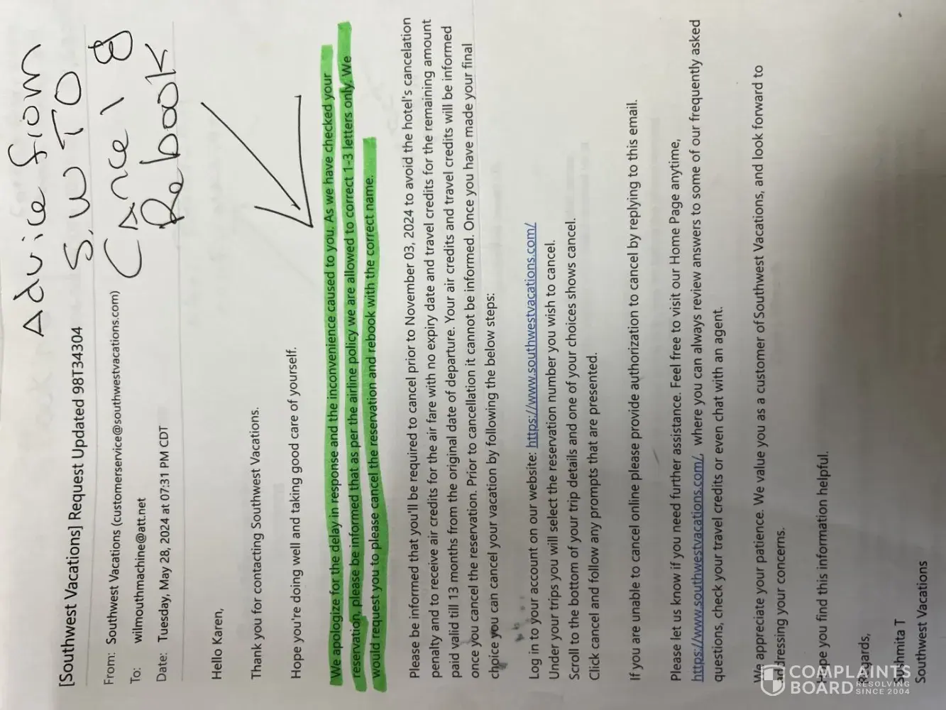 Southwest Vacations complaints: history and resolution overview