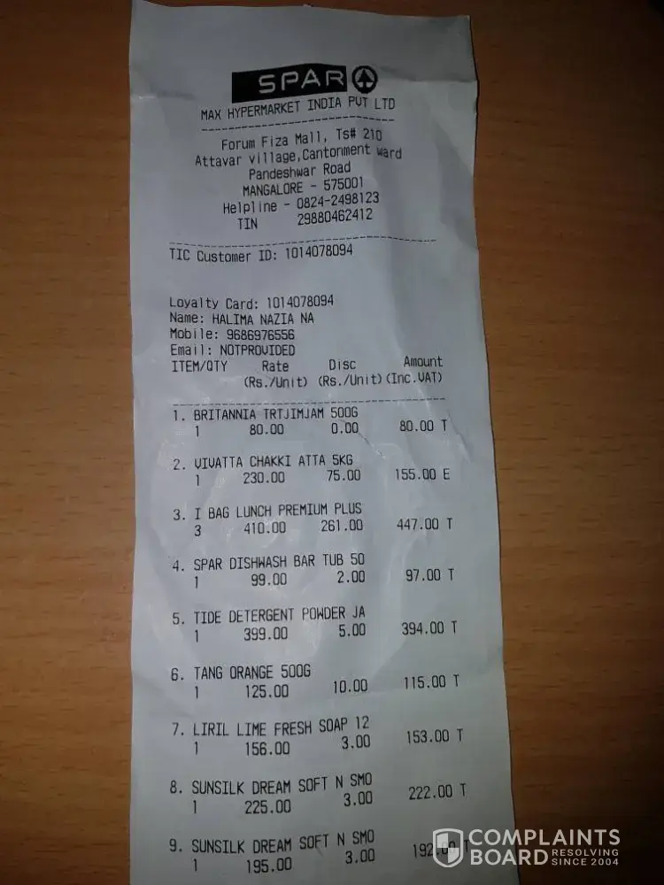 Repeat invoice of single item is being made at Spar mangalore forum mall shop and customer looted at the hands of cashier