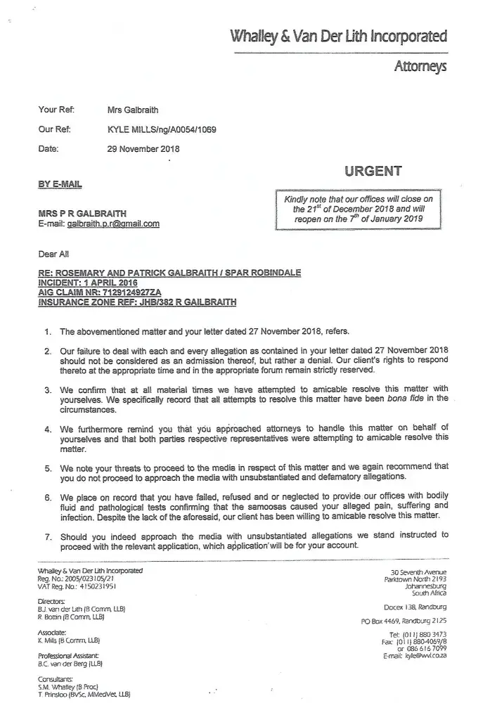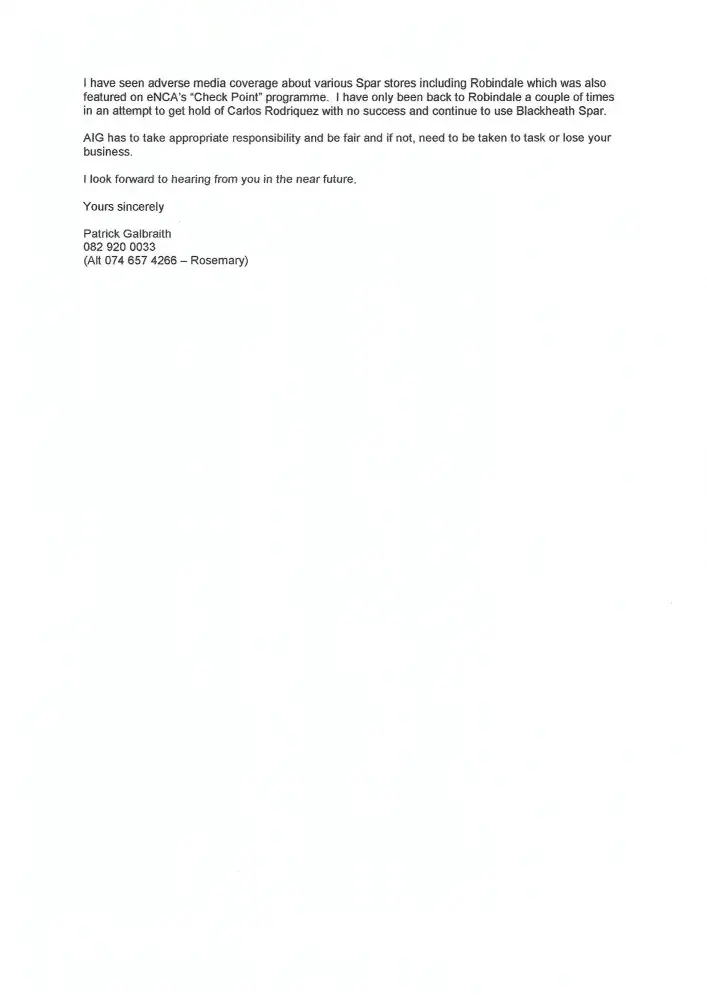 It is out of due respect to you, Mr Kyle Mills (attorney), my dwindling respect of Spar SA and no respect to AIG Insurance, that I have not gone to the media yet. So, Mr Mills, let this be the last of the correspondence and emphasise to your clients to bring finality to this matter and pay due respect to me and the final figure I have tabled please.