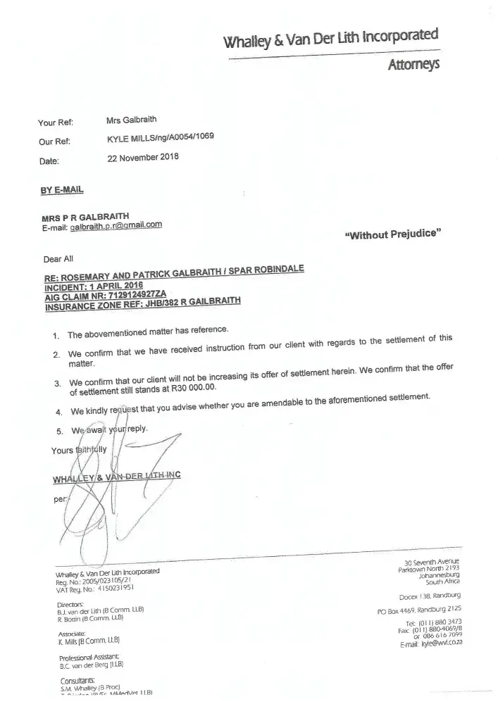 Spar SA then had their area representative, Mrs Lesley Pieterse, call us to advise that Spar SA will offer us about R7 000 (seven thousand rand) which was about our medical expenses only (which is not for our account but to be refunded to our medical aid, plus interest) and to sign our rights away with certain documentation being presented to us. We declined and Mrs Pieterse asked how much we wanted? (refer our email of 28 August 2018 - point 9).