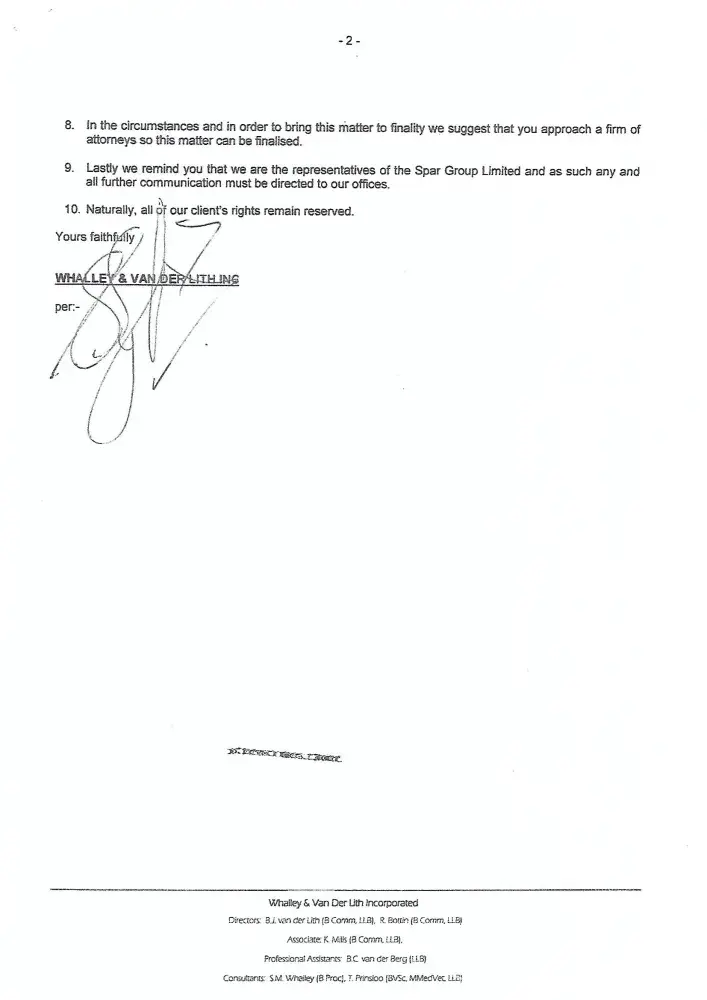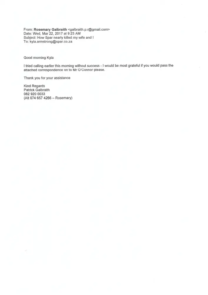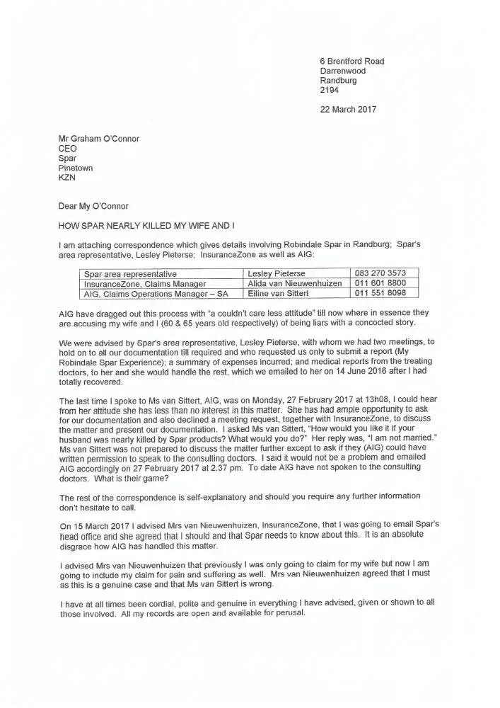Attached is a copy of a brief letter dated 22 March 2017 to Mr Graham O'Connor, CEO, Spar South Africa, telephone number +[protected].