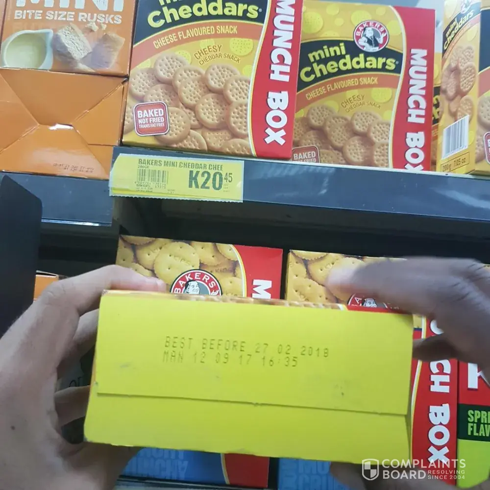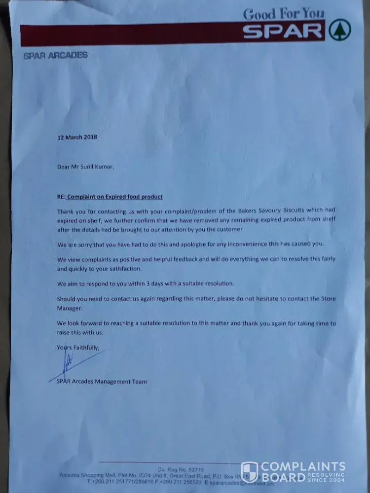 On 9.3.18 I went shopping to Spar Supermarket at the Arcades Shopping Mall in Lusaka, Zambia. Amongst other food stuff, I had bought a Packet of Biscuit. When I opened for Break-Fast on the 12.3 .18, It did not taste good, so I looked at the Expiry Date on the package (Box) and noticed that SPAR had sold me an already expired food product, The same day in the afternoon I went back to Spar and first straight went to the Biscuits Department (Shelves) to find out whether only my packet was expired or were other packets of the same type were also expired.to my surprise there were several packets still on the shelve with expired dates having passed (for which I managed to take photographs whilst on the shelve), I quickly brought this to the attention of the Store Manager,