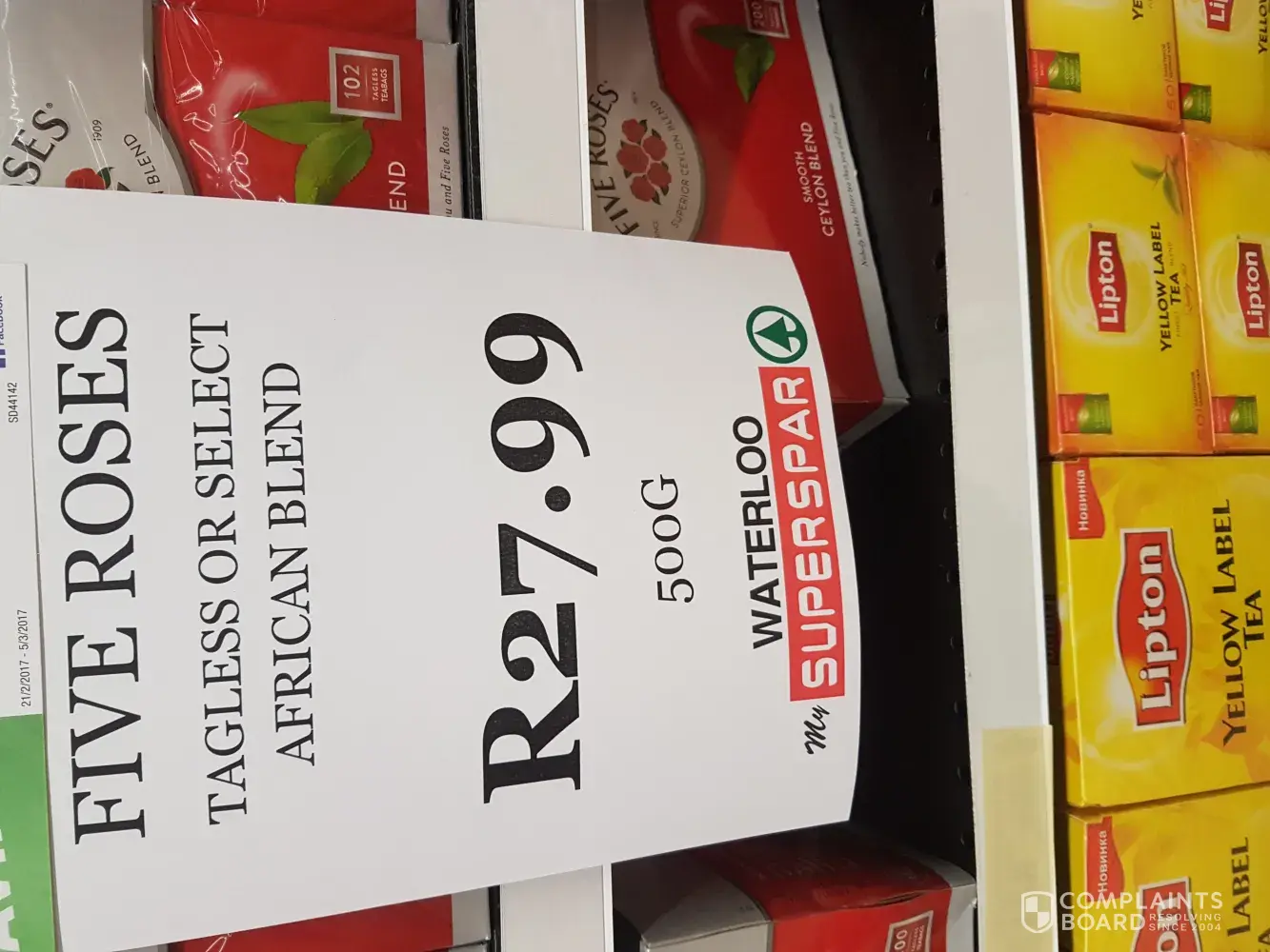 I visited the store on Saturday. I purchased groceries to the value of R742.54. I realized that I was overcharged for 2 items. Both items were fiveroses 500g tea bags which was advertised for R27.99. I have a photo of the advert in my possession.