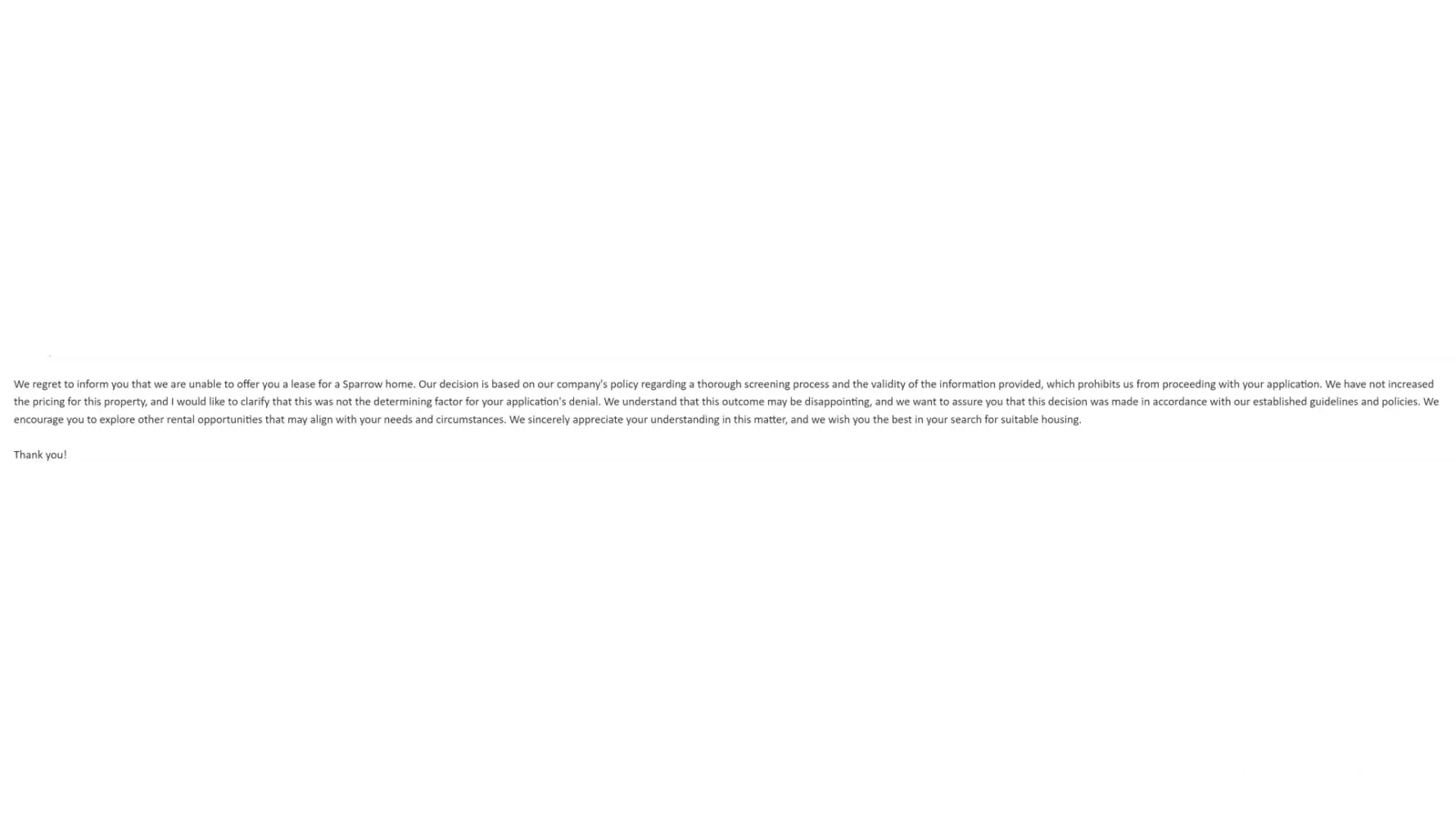 Given that the exact same thing happened to me, I assume that because Sparrow Now owns the property they are attempting to sell the property and in the meantime they collect application fees while in the process denying them. Absolutely disgusting and deceitful business practice