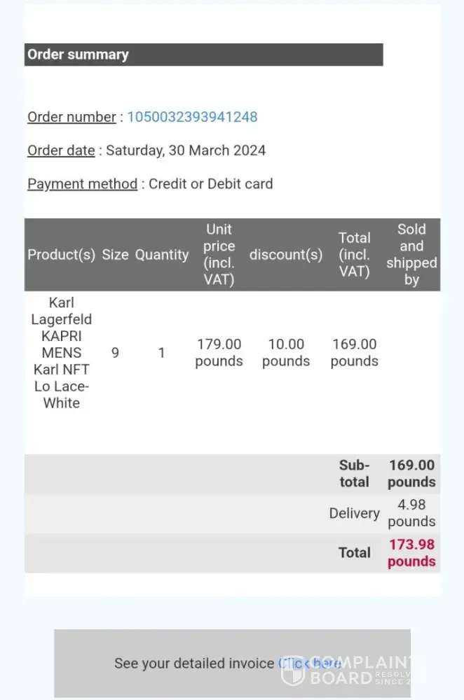 âš ï¸â›”ï¸âš ï¸ I just received my order. Shocking! UPS charged me £ 45 because is shipped from France I didn't know that however the extra delivery charge should be applied on total of the order not on website or any other paragraph. 1000 of orders coming from abroad no one duble charge on shipping clothes shoes or small things. I ordered just shoes from this 🇬🇧 UK site . So on my order said delivery ups 4.98 and then on delivery the Ups guy asked £ 45 PAID and if you need return other £ 45. Crazy âš ï¸Everyone have this problem have to report this site.Ombudsman Google or wherever. NEVER AGAIN. â›”ï¸