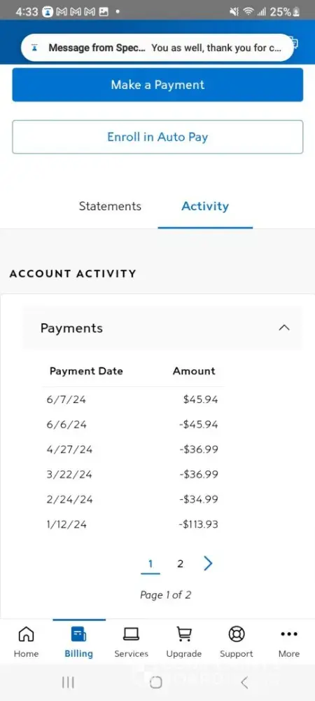 I had a balance of 96 something that was due by the 9th of June. On June 5th I made a payment of my back balance owed (that was allowed) of 45.94. The payment fully went through on the 6th. And was taken out of my bank account. Today, the 7th of June I got a notification from my bank that another payment from spectrum was taken out. So I got on my spectrum app and it stated as follows... thank you for your payment, it is currently being processed. Remaining balance due...0.00