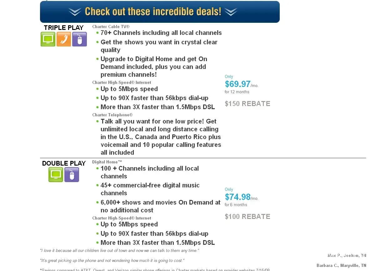 I'm looking at this great deal from Charter for cable and internet & phone but there's no way I'll deal with them - two friends have been cheated by these folks. One called to find a way to lower her bill, was told to do xyz, which she agreed to and the next month her bill, instead of being $40 LOWER was $20 HIGHER. When she complained was told, so sorry, you misunderstood...because there was nothing in writing, nothing my friend could do. And she deals with such details every day on her job...not just a misunderstanding! I won't even consider dealing with Charter - that's the second friend with a similar complaint - they tell you one thing and then you are NOT pleasantly surprised that what you heard and what you got are 2 different things. And no one has said good things about their business.