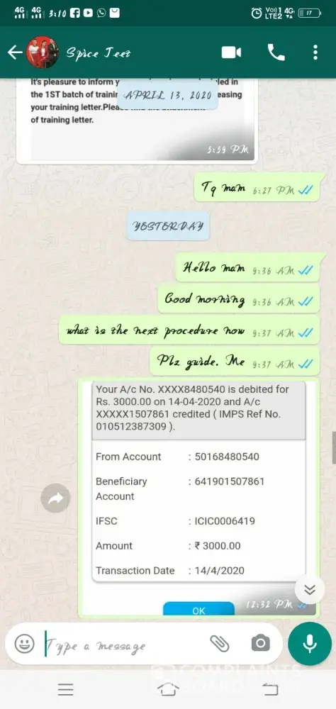 Please help me get my money back I am big trouble right now. A lady called me and said that I've got shortlisted for job in Spicejet Airlines and asked me pay 1860/- for proceeding with interview process and conducted an online test. Then next day they conducted a telephonic interview who is claiming himself as Aryan Singh Lead HR and from Spicejet headquarters and said that I've selected and if I'm interested to join then I've to pay 8500 /- for gate pass which will be refunded within 7 days. After payment I got to know that it's all fake and I asked for a refund. Now she is saying that it'll take 90 working days without any proper information. Please help me to get my money back. I am in big emergency right now. I've even asked for the proof of payment then they've sent me a receipt which is not so convincing.