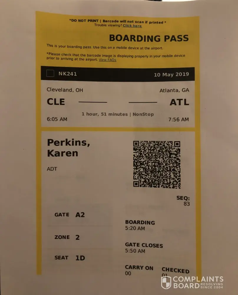 My sister and I booked a flight with Spirit Airlines. We were to board flight NK241, gate A2 at 5:20 a.m. We were to fly a connecting flight in Atlanta GA, flight NK1077, gate D4 at 7:56 to Fort Lauderdal arriving at 10:40a.m. and from there ride a shuttle bus to Miami FL to the Carnival cruise ship.