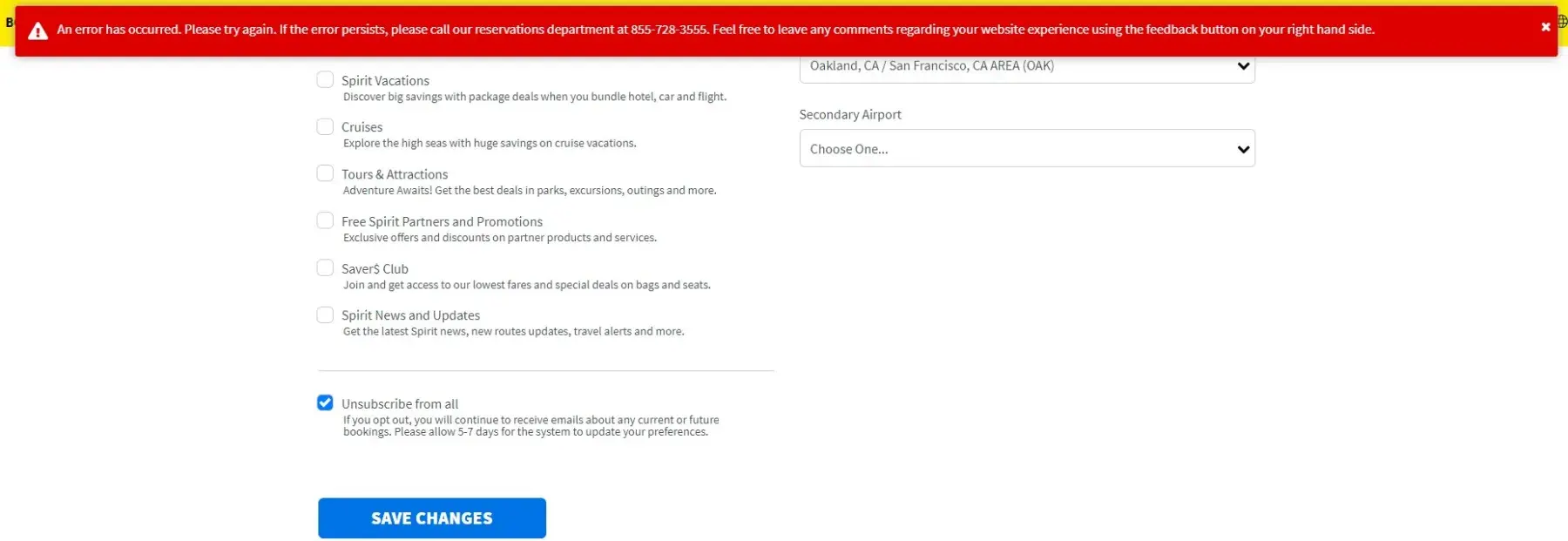 I have tried to unsubscribe to Spirit Air's email marketing several times in the last month and get the same error pop up every time I try.