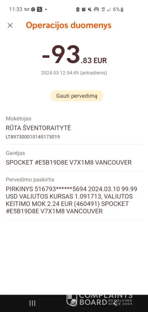 PIRKINYS 516793*5694 2024.03.10 99.99 USD VALIUTOS KURSAS 1.091713, VALIUTOS KEITIMO MOK 2.24 EUR (460491) SPOCKET #E5B19D8E V7X1M8 VANCOUVER