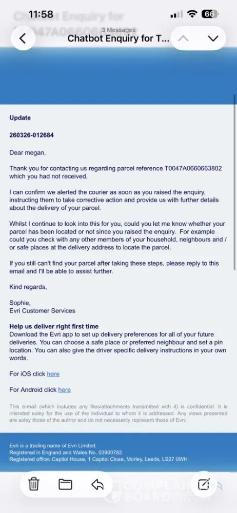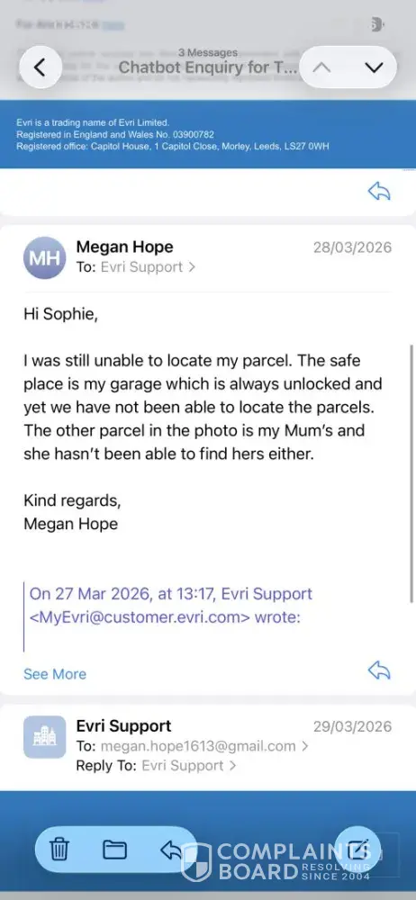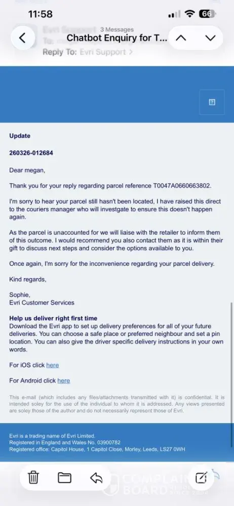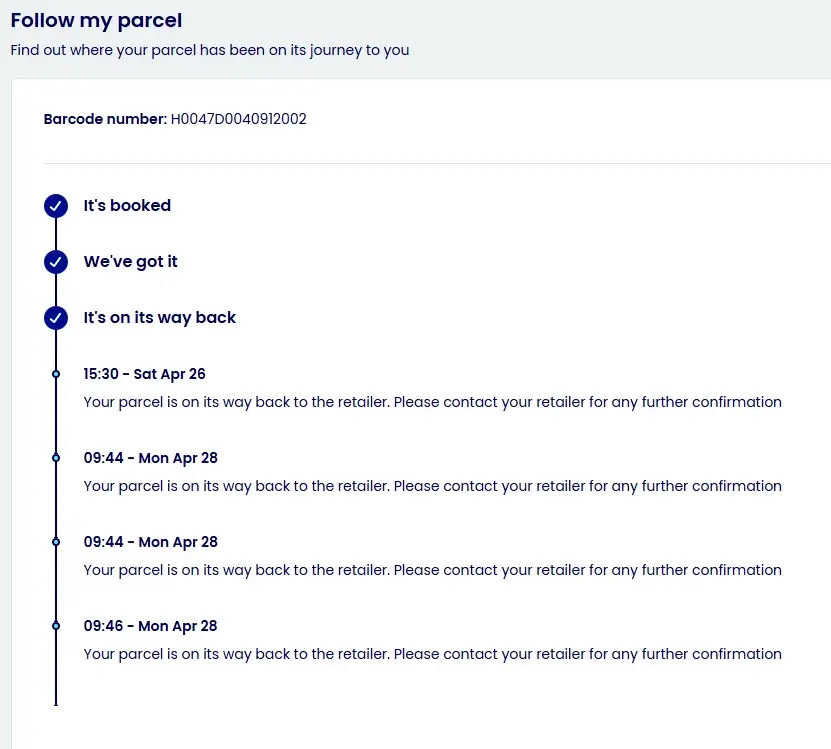 I received an email confirmation from Sports Direct Saturday 26 April confirming that my returns were on the way to Sports Direct. The Evri parcel details confirm that I should contact the retailer for any further information but there is no way of doing so. I still have not received any further email correspondence and there is no way of getting in touch...
