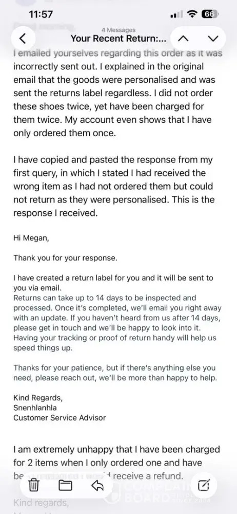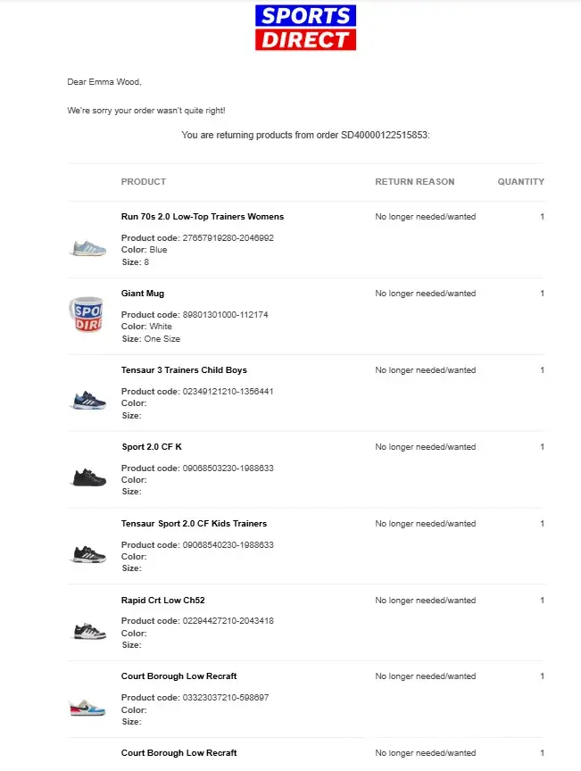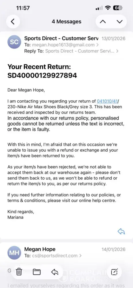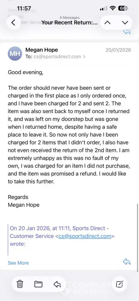 For Christmas 2025, I placed an order for a pair of Nike Air Max Shoes Size 3 with personalisation as a christmas present. The order was placed, charged, and sent and I received the order. Around 1 week later, I received the exact same order, as charged again, yet on my Sports Direct account it was only showing the one original order. I contacted Sport...