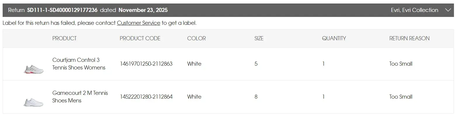 I placed an order on 2nd December 2024 Order ref sd40000117899368. From that order, I did not receive one of the shoes (product Code - 210341/40/255) which I was told was in process and after many conversations about it being in the warehouse was told it wasn't available and finally got a refund for it in February 2025. I returned the second product...