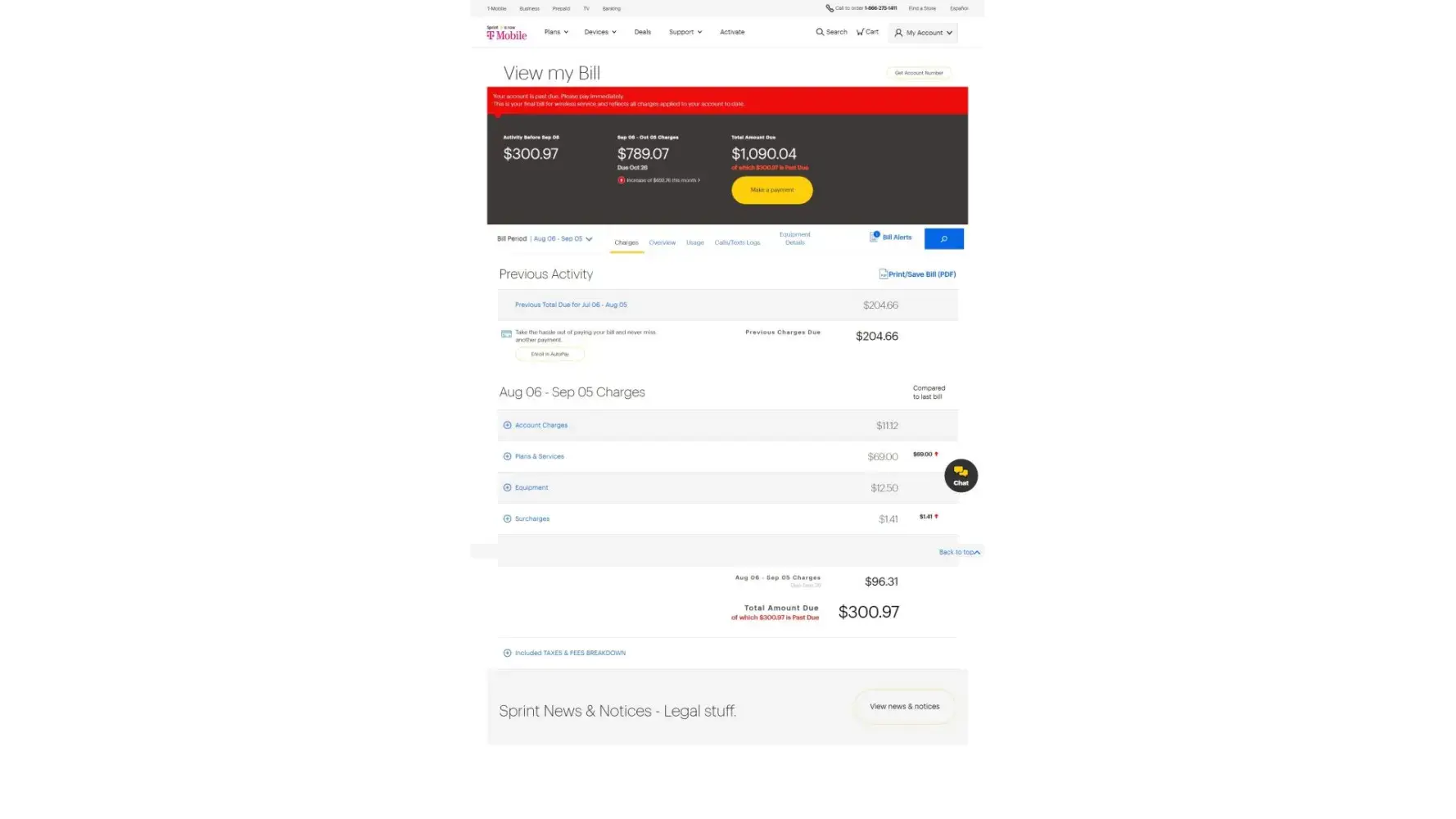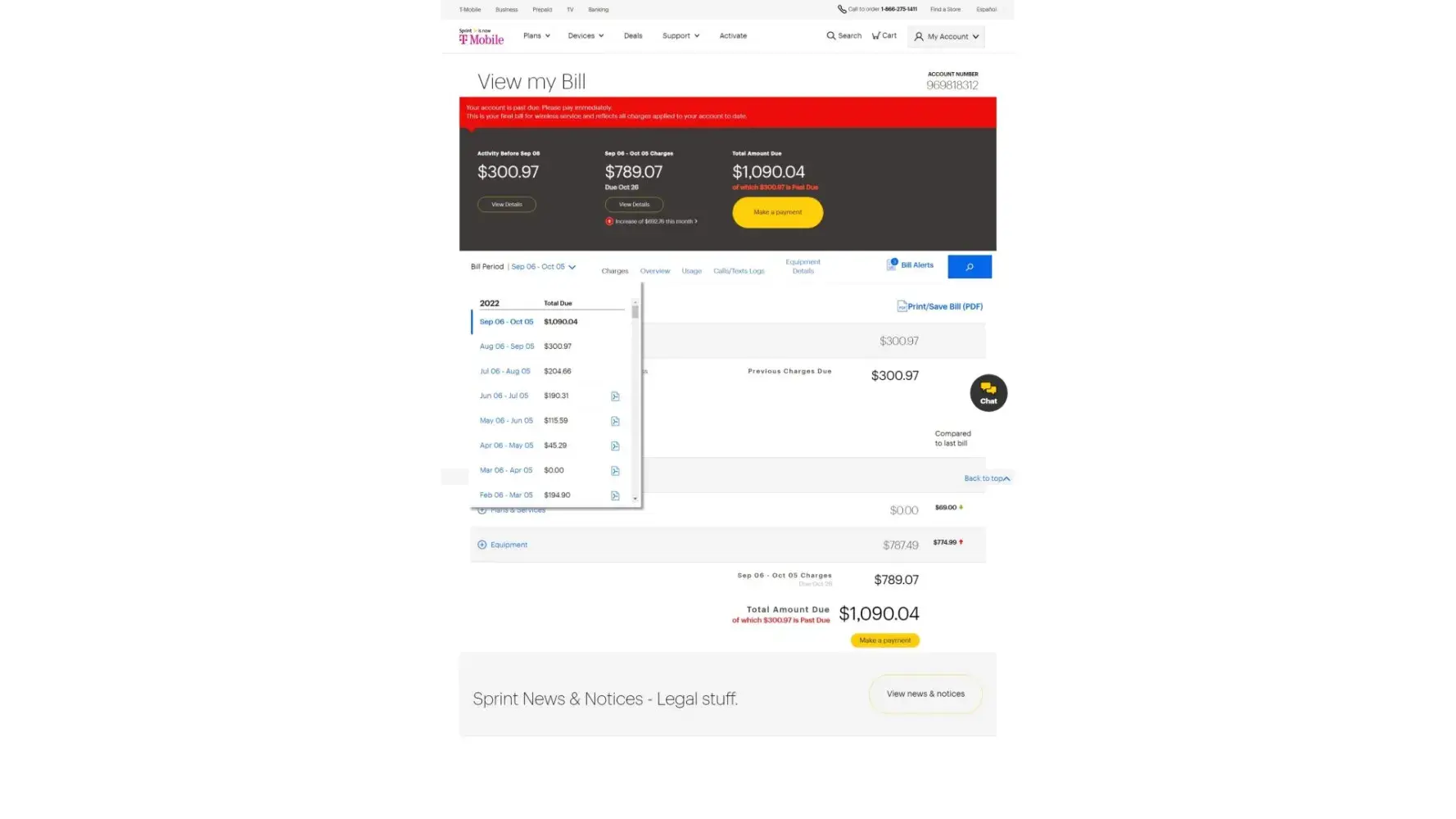 In 2021, Sprint charged me for a phone on my bill that was supposed to be taken off my bill due to my Fiancée passing away in a car wreck in November 2020. I paid several times to have the phone taken off of the bill. I even went out to the field where he wrecked to search for the phone. Finally, it was taken off January 2022. September 2021 added another phone to my plan, and it broke within the first 30 days. Exchanged it and they charged me for 3 phones up until January 2022 when I only had 2 phones on my plan, so I decided to not continue with the second line on the bill to only keep 1 phone on my plan. At the end of March, I called Sprint back since my bill still was not right. Charging me again for the phones and the bill was a different price which it always it. I talked to a supervisor, she ended up getting rude with me and hung the phone up. Called back and talked to another supervisor that said he did not like what was going on and saw that I have called several times and more than anyone should. He looked into my billing and got back to me in April 2022 that he fixed the billing, and I would not have to pay anything until August 2022. He offered me a FREE upgrade of a phone and said I only had to pay the taxes which was $65.25, and the amount was to be credited to my bill that he did not want me to pay a thing since I have overpaid for a long time and the supervisor hung up on me. Checked bill in July and it showed I owed $200, so I called. I have been fighting with Sprint since. Supervisor said she pulled the call up from April with the other Supervisor and said some things were fixed but not all and I was to get a returned call. Week later I'm calling and being talked rude too, so I ended my plan with Sprint. They sent me a final bill that was $300.97 then one a few days after that for $1090.04. I noticed PDFs of billing online were removed and I was charged for the FREE phone I was promised in April. They remove what was paid as well on the billing page. It's quite hard to go back to recent bills them doing this. Before canceling plan, I could only go back to September 2021 with bills and now it is October, and they added the PDFs back to the billing that weren't there before I cancelled my monthly plan.