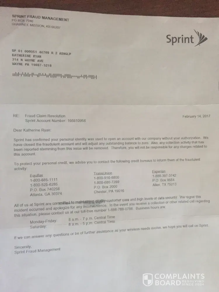 My wife received a bill from sprint for over $4, 000 for an acct that we do not have?! We followed all of the sprints fraud guidelines, police report et al and mailed them in as directed. Recently received a letter from sprint fraud management confirming that it was a fraudulent acct and they would rectify acct immediately by stating 'closed the gradual tone account and adjust any outstanding balance to zero'. They also stated that 'any collection activity that had been reported stemming from this issue will be removed. Therefore, you will not be responsible for any charges related to this account.' (see attached photo of letter)