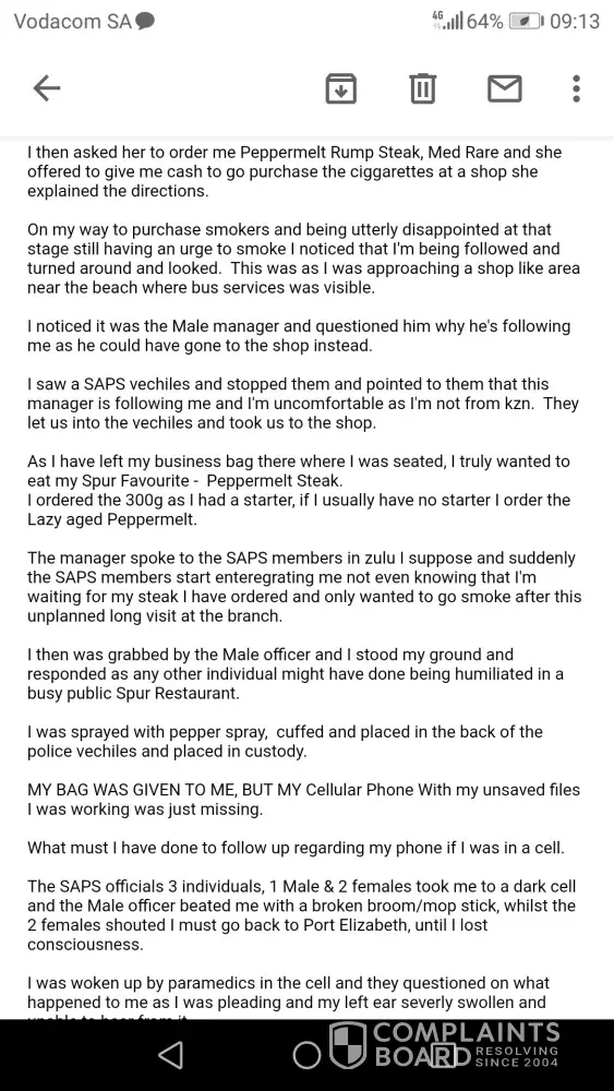 I am complaining about the service and treatment I got from the manager at spur Southgate mall.