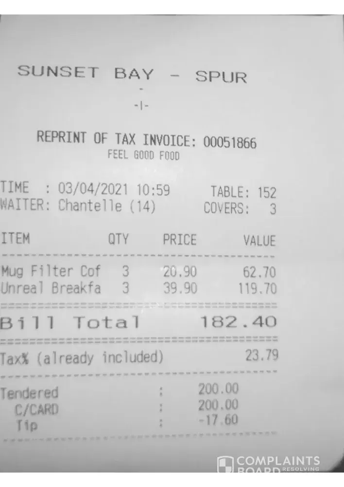 At first I don't know whether this will be filed as a formal complaint but I just have to say something about my experience this morning at your branch in Gordons Bay. Me and my family visited the restaurant to have an on the go unreal breakfast.( Please see the attached)