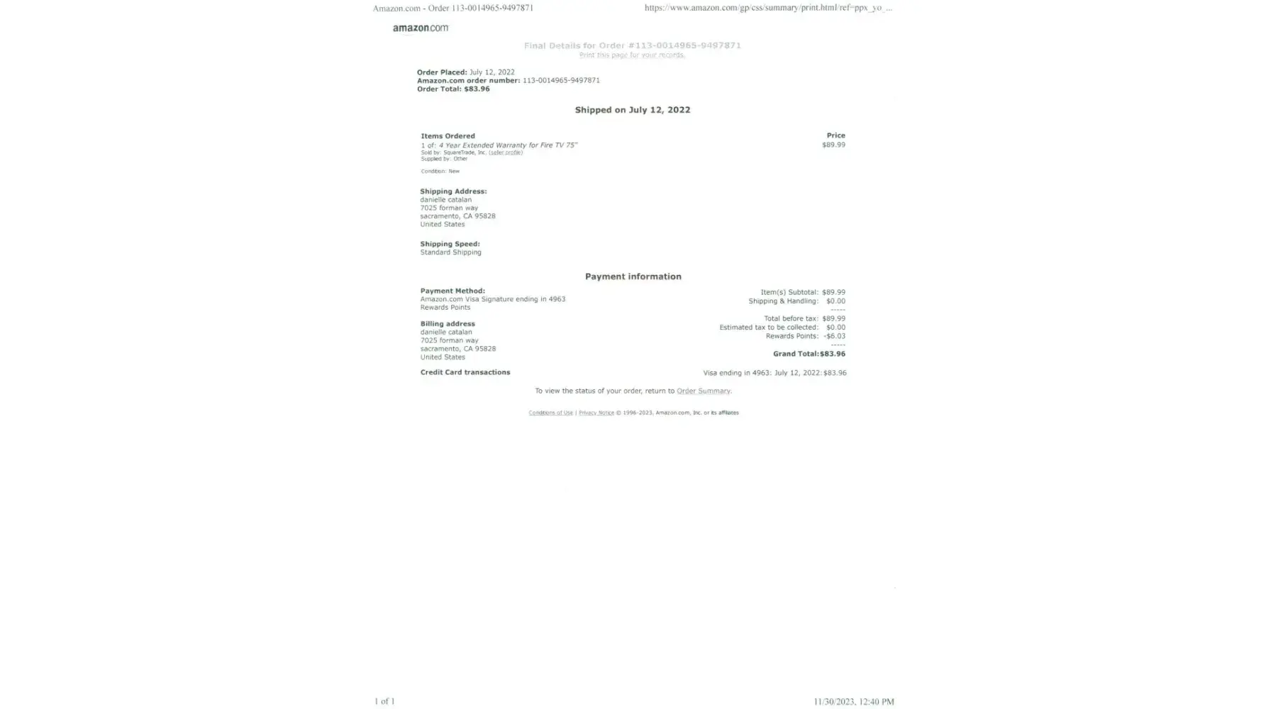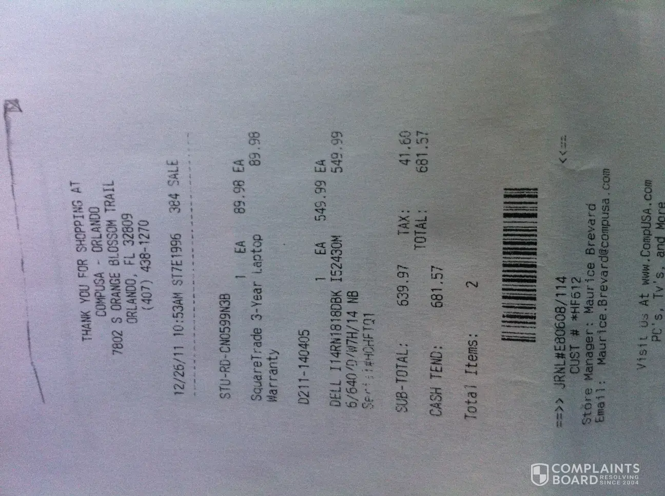 I bought a dell laptop (model I14RN1818DBK I52430M) on 12/26/2011, at COMPUSA company, in Orlando, Florida. I also bought a 3-year SQUARETRADE warranty because they assured me it had international coverage.