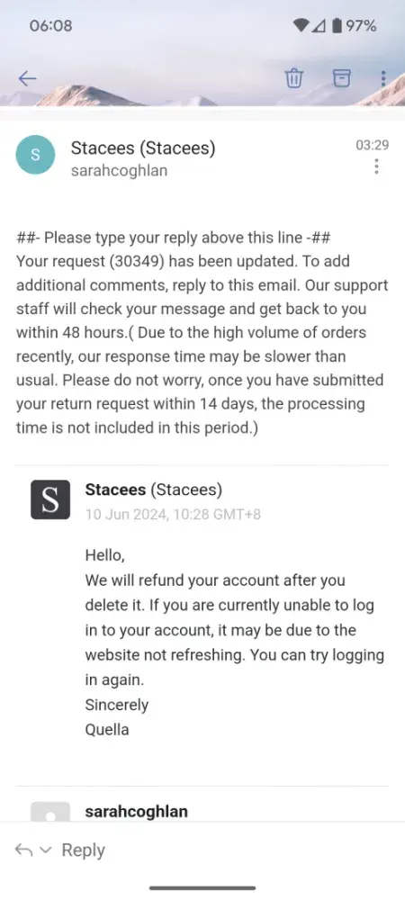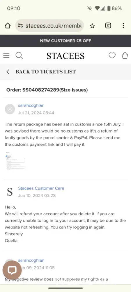 I ordered a dress from Stacees which i was very apprehensive about doing - I did research, checked their return policy and spoke to someone and their chat and was reassured that I can return if if it not suitable for a FULL refund. Unfortunately the dress didnt fit property, the material very scratchy. They are refusing to give me returns address and...