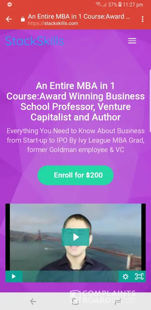 Stackskills should be sued for fraudulent representation. I purchased an online course for $15 that then required a "school enrollment" for $200 to redeem or access the course. No section for refunds or complaints. Waste of money and digusting way for anyone to make money - deceptive and disgraceful. These human beings probably don't look at themselves in the mirror or they would be disgusted of what they saw. No shame at all. Will be looking into a way to create a class action lawsuit over this gross injustice, they don't deserve my $15 charity. False advertising and marketing tactics like this should be illegal worldwide. Facebook also needs to own up and shut this down.