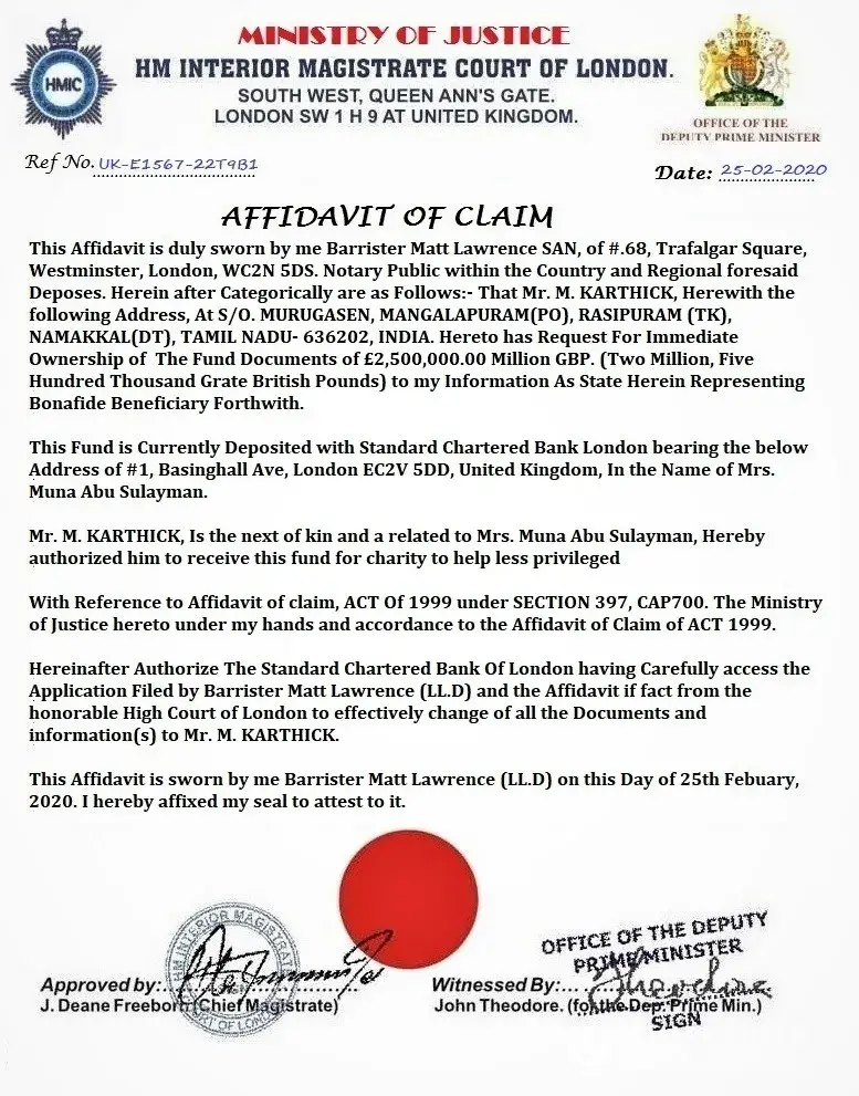 We have concluded with Mrs. Muna's advocate; (Barr. Matt Lawrence) who had provided us with all necessary documents as applicable and had made an agreement on the proceedure for your fund transfer. We have agreed that you should provide this amount as part of your commitiment towards this whole process.
