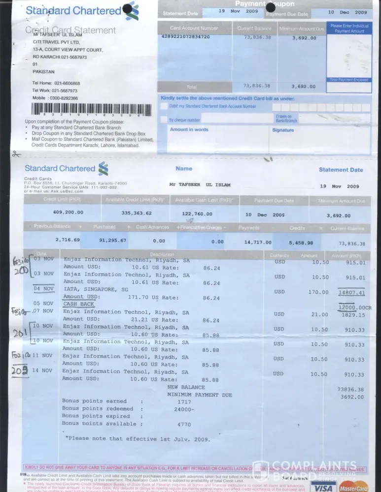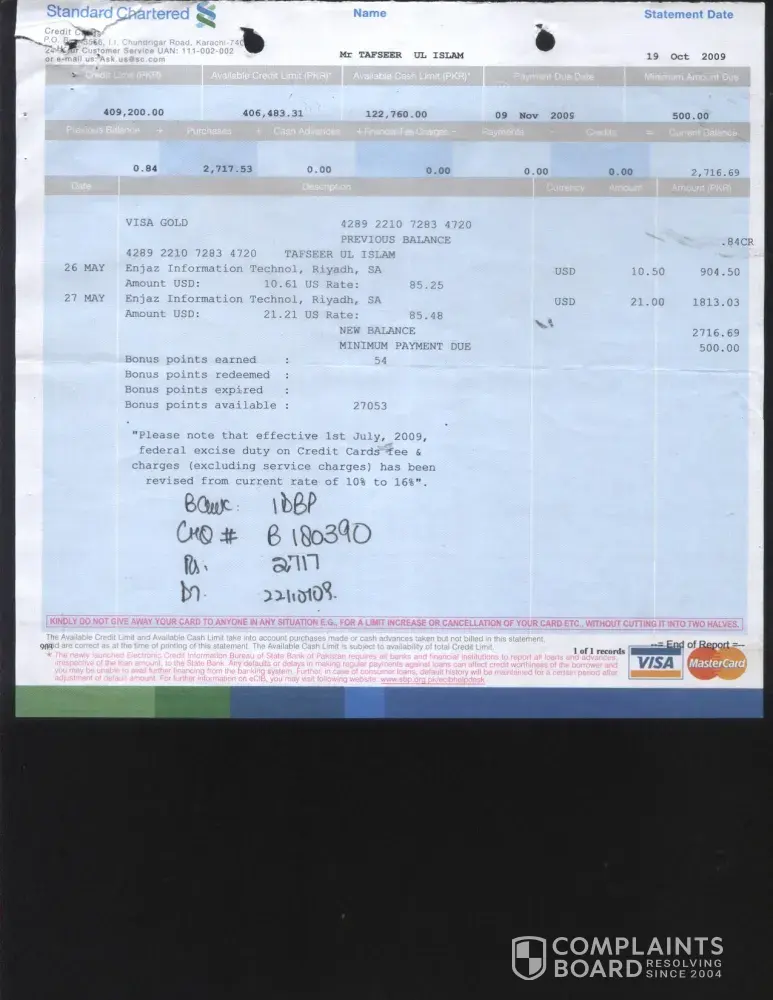 I would like to divert your kind attention towards the credit card transactions on my Card # [protected]. I got statements dated 19th Oct 2009 and 19th Nov 2009 amount Rs. 2716.69 & Rs. 73836.38 which I paid on 22nd Oct 2009 by cheque # B 180390 amount Rs 2717 and 4th Dec 2009 by cheque # B 182703 amount Rs. 73840/- (Statements enclosed) regarding different transactions in which Enjazit Information Technology, Riyadh Saudi Arabia USD $ 672 is discussable.
