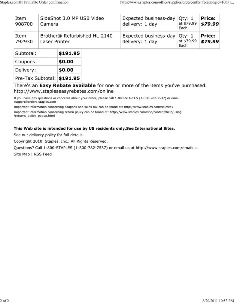 On Saturday, August 20th at 10pm I went to order a Brother Printer (Item 792930), 3 8gb flash drives (Item 785429), and a 4pk of Gel Ink Pens (Item 924579). I also added a $25 off $75 coupon (# [protected]) and a coupon for a Free USB Digital Video Camera (# [protected]). Both coupons were accepted without any issue.