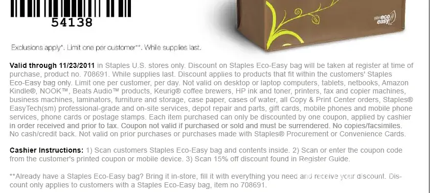 I received an email from staples and it told me I could use these to buy HP toner with 15%. Later, when I got the staples, they just said that is a mistake and won't give me the deal. They fooled me. A company could send wrong email and fooled the costumers. What a "big" company it is!