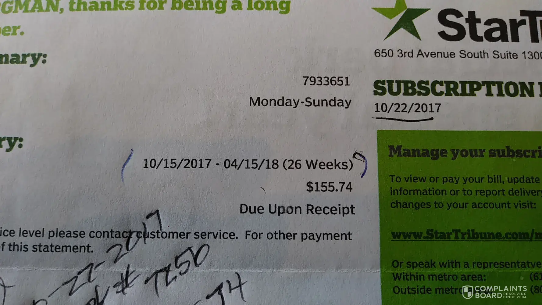 I made a comment and posted both photos of our bill and they used only one... Here is my bill where they didn't honor the price we paid... We lost 46 days of the paper .. Cuz we paid by check .. We found this out on 02/11/18. When our bill arrived. Our bill was from