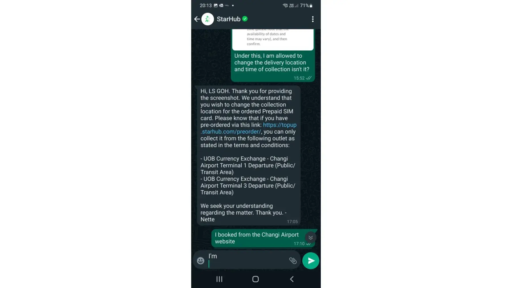I ordered 4 prepaid SIM cards (see attached) as they do not seem to be able to be topped up. However, I did not know that they will be activated upon collection. I will be in Singapore for a month from 5 July to 5 Aug and hence bought 4 prepaid cards, each for 7 days thinking that I will activate it as and when I need it. Now after researching, I found that all the 4 cards will be activated on the same day. Note that this information about activation is not on the Changi airport website that I ordered the SIM cards neither is it stated on the vouchers sent to me. I am now asking to change the collection point and collection time for the 3 remaining SIM cards such that I will collect the 1st card at T1 Changi Airport on 5 Aug when I arrive in Singapore, 2nd card at NEX on 12 Aug, 3rd card at NEX on 19 Aug and 4th card at NEX on 25 Aug. I think my request is reasonable given the activation on the day of collection is not stated as mentioned above. I whatsapped Starhub and the help desk just said nothing could be done. As a Singaporean living abroad and now returning to Singapore for a month, this first experience is not very welcoming 1I want to reiterate that your email to me does not even talk about activation on the same day. My trip to Singapore is on Tuesday (5 August) and I have given ample time to Starhub to resolve the matter. Your help desk colleagues' feedback contradicts with your website which allows customers to change the place to collect the card. I also learnt subsequently that I cannot buy more than 3 SIM cards yet when I bought 4 cards on named basid, your system just happily accepted my orders. I would expect your system to decline my purchase. If I cannot collecy rtg card at a later date and at a different collection point, I want refund of my money. As a Singaporean living abroad and now returning to Singapore for a month, the current experience is very bad.