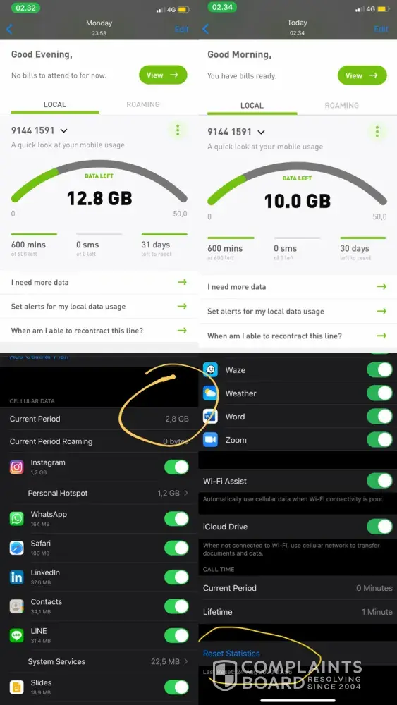 As you can see from the screenshot, the overall data was reduced by 2.8 GB, the same amount as my overall usage. Which is very wrong because instagram shouldnt be counted. Please take note that I already matched the date.