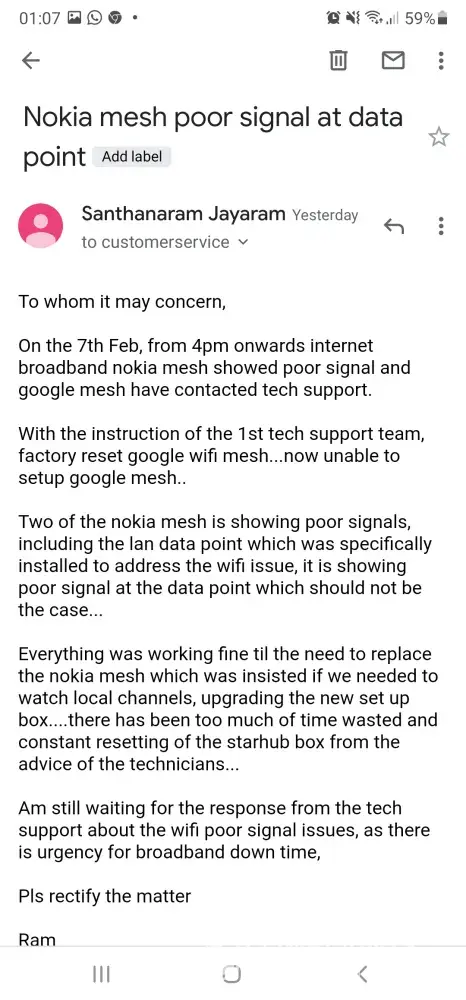 My family and I have been loyal Starhub customers for many years. More than 2 years ago, I had moved to a new condo and since then, I had been having very poor mobile network signals or no signals at all in my house. My spouse and I had been putting up with this issue all this while until May 2020, when we had to work from home due to covid19. Your technical team came to check on the problem then but nothing was solved to improve the network as they were tackling the external network issue instead of the network in my house. They mentioned that they will monitor the situation and promised to rectify the issue. I waited for the solution but it never came. Recently on 4Jan, I began to check with Starhub on the issue again. The following is what that had happened: